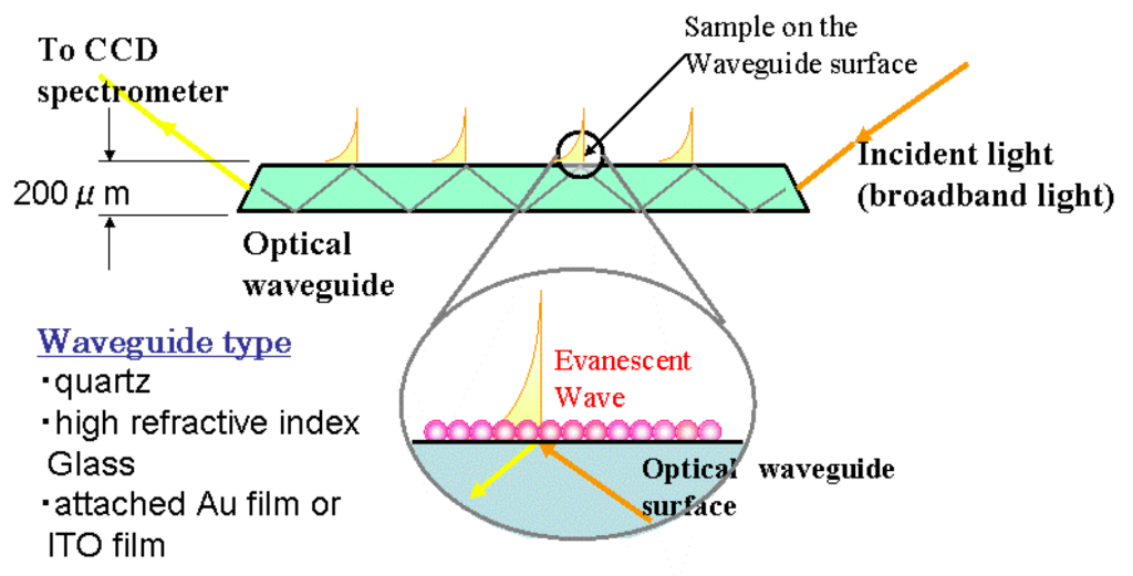 而對(duì)于SIS-5100,它是利用光波導(dǎo)光譜學(xué)來(lái)測(cè)量放置在專(zhuān)用光波導(dǎo)上的薄膜樣品的吸收光譜(無(wú)需任何厚度調(diào)整)。理論上,當(dāng)白光從一邊入射到石英光波導(dǎo)(片)上,會(huì)反復(fù)反射并產(chǎn)生消逝波,通過(guò)檢測(cè)消逝波,可以實(shí)現(xiàn)高靈敏度的測(cè)量