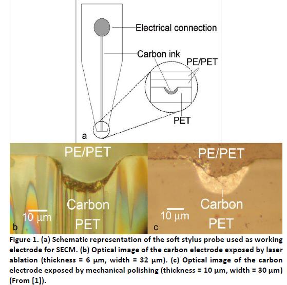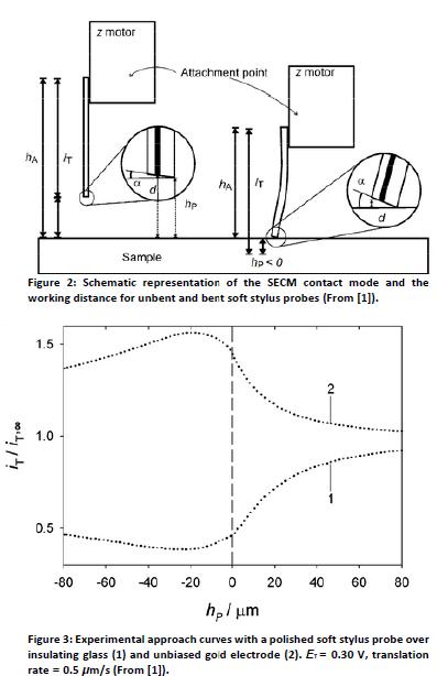 這些柔性探針壓在基體上時可以彎曲,這樣聚乙烯對苯二酸酯層一直通過彎曲接觸。這個聚乙烯對苯二酸酯層的厚度定義了基體和活性電極區(qū)域的固定工作距離。當掃描粗糙表面時,探針的彎曲可以適應形貌特征,因此可以不需要額外的電反饋系統(tǒng)(像AFM系統(tǒng)中)保持一個幾乎固定的工作距離,甚至可以提供那些太粗糙以至于無法AFM成像的表面的圖像[1]。