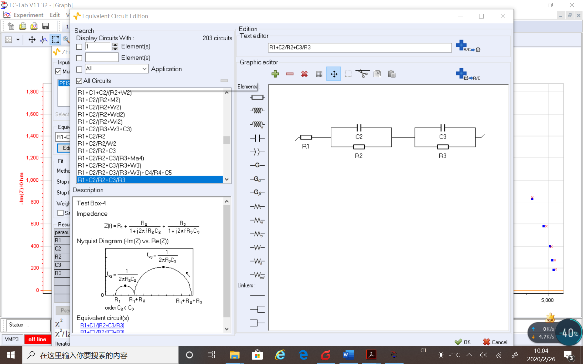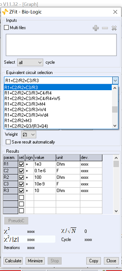 Equivalent circuit selection部分用來選擇擬合電路,其下拉菜單中有軟件預存的很多電路模型(以EC-Lab v11.32版本為例,約有200多種預存電路模型)。
