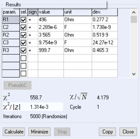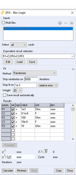 Minimize按鈕則用于計算每個數據點的阻抗值,并縮小計算值與實驗值之間的距離。擬合過程中可多次點擊,以獲得最小誤差值。