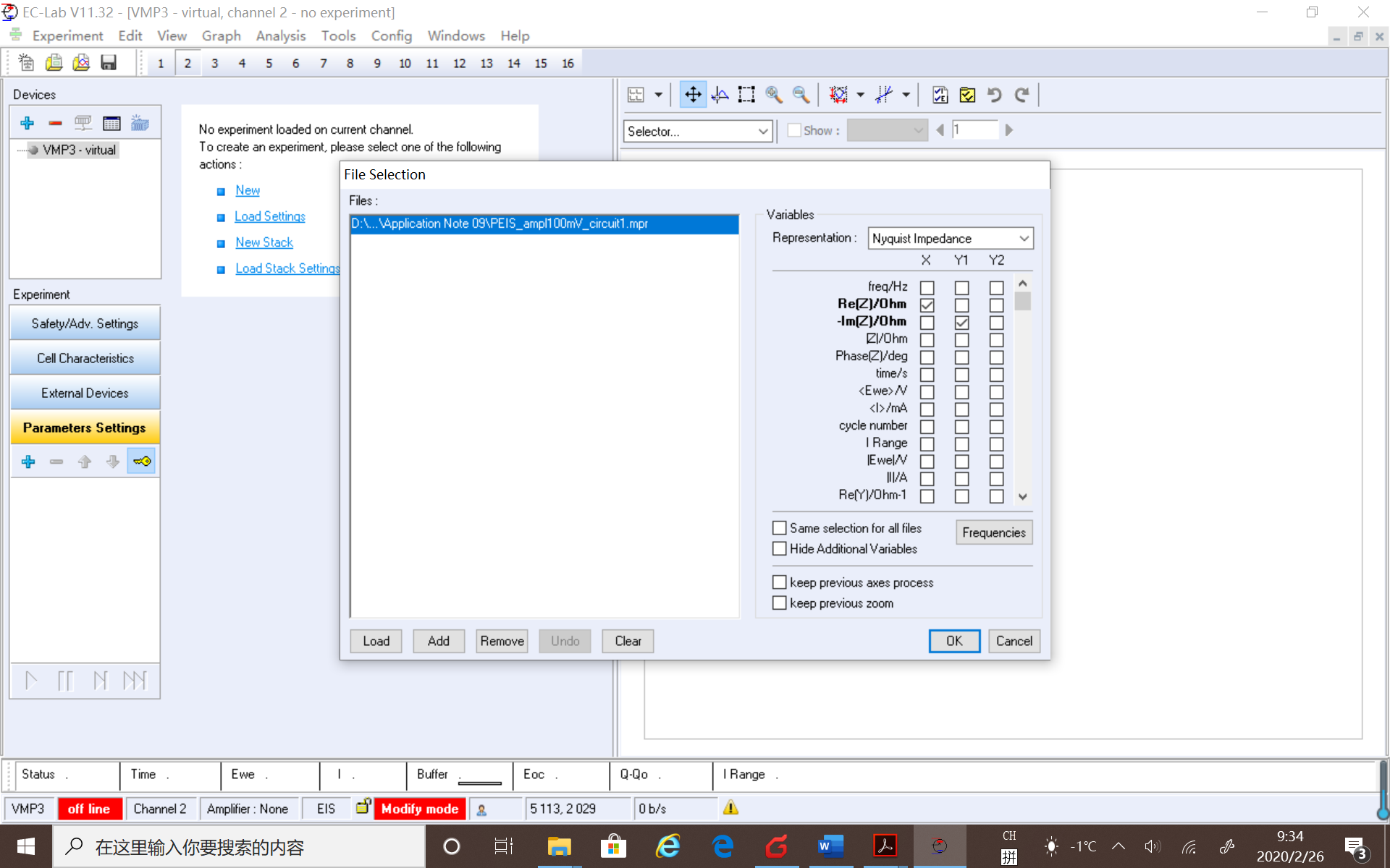 EC-Lab軟件打開EIS數據(Experiment→Load Data File...→選擇數據)或者直接雙擊打開EIS數據文件。如下圖選擇X、Y軸數據類型。