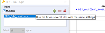 Inputs部分用來確定擬合數據,如果導入的EIS數據包含若干cycle數據,那可以在這一部分選擇需要擬合的數據圈數。如果要用同樣的設置來擬合多個EIS數據,那么可以通過“+”選擇其他EIS數據文件,如下圖。