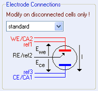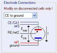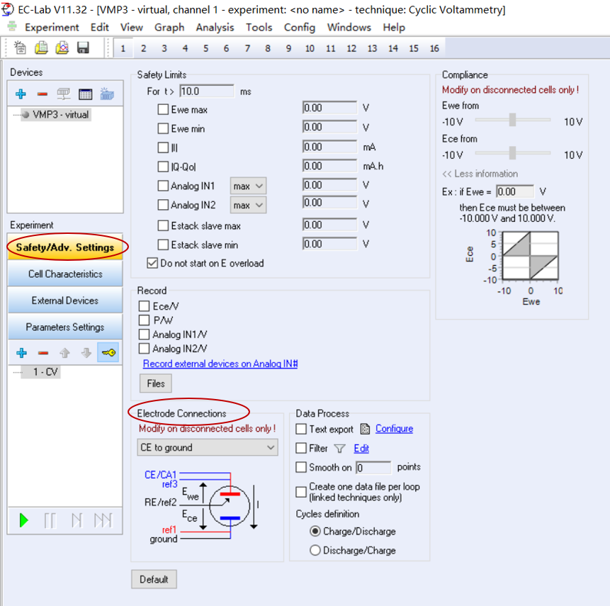 EC-Lab軟件中,添加實(shí)驗(yàn)后,在左側(cè)Safety/Adv. Settings下有一個(gè)Electrode Connections部分,其中可以選擇standard、CE to ground或者其他大電流儀器的連接方式(如下圖)。