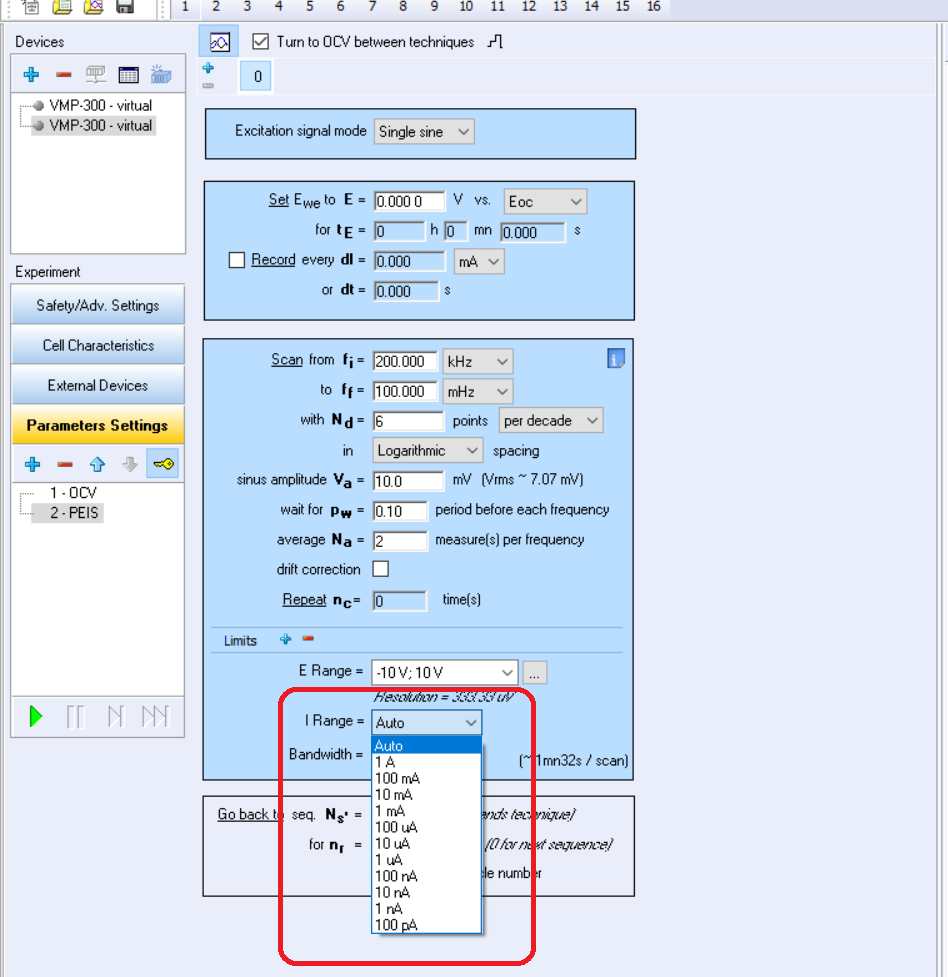EC-Lab中大部分實驗技術的參數設置中,都有Current range這一項。用于確定實驗的電流范圍。下圖為PEIS實驗參數設置中的I Range。