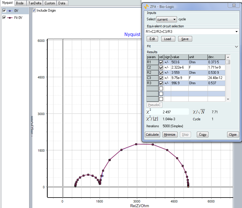 如儀器功能正常將會得到雙圓弧的Nyquist圖結果: