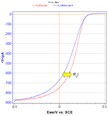在數據對比中可以清楚的看到歐姆降的影響,串聯電阻后的藍色曲線結果與正常測試結果對比產生了明顯的偏差。在相同電流時引起的電位差別就是因為串聯進體系的電阻引起的,比如在電流為-500μA時,電位分別為150mV和98mV,與我們串聯進體系中的100歐姆電阻影響相對應。
