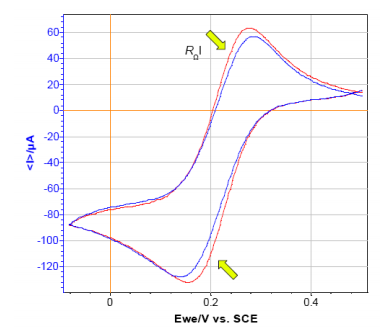 同樣,在循環伏安中歐姆降也會對數據結果產生影響。