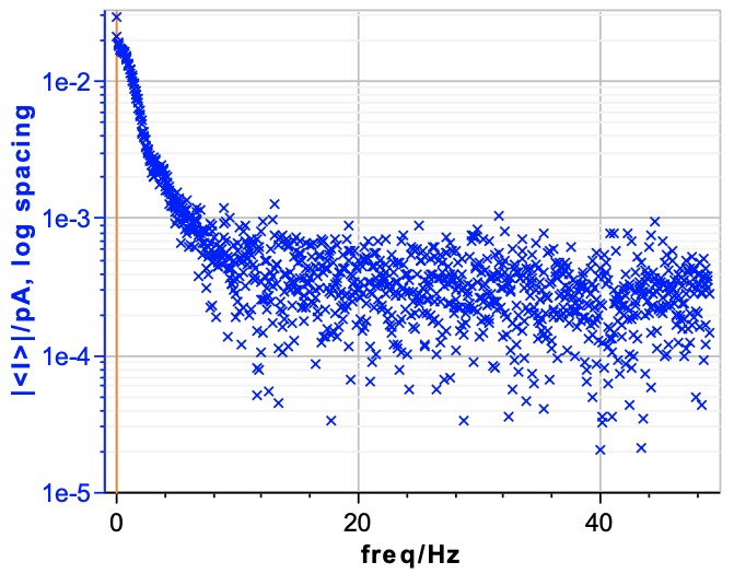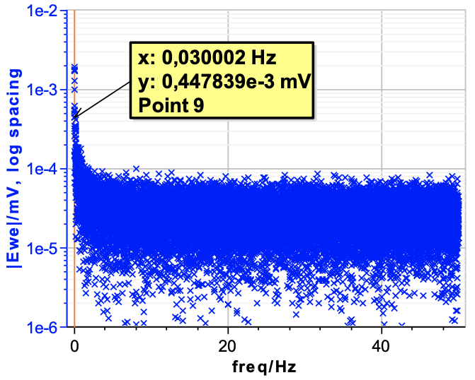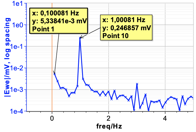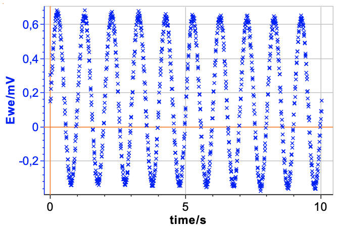 本文使用VSP-300電化學工作站。對于程序1,使用超低電流(ULC)選項。電流范圍為1pA,用ZRA技術記錄ECN,用OCV快速技術記錄EPN。對于程序2,不使用ULC選項,電流范圍為1μA。使用CASP技術生成0.5 V振幅(或1 V峰對峰)的1 Hz正弦波。用ZRA技術記錄產(chǎn)生的電位。對于這兩種程序,均使用最小的電位控制范圍,允許1μV的控制分辨率。在測量的電流和電位上應用低通1 kHz模擬濾波器。此模擬濾波器可以在“Advanced Settings”選項卡中選擇。采樣率為100Hz(即每0.01秒一個點)。測量持續(xù)時間為300s,這意味著可以觀察到的最低頻率為1/(300)≈3.3mHz(見附錄)。