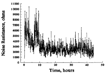 上篇文章(EN:電化學噪聲(1))的結論是Bio-Logic恒電位儀的本征電位和電流噪聲比美國材料試驗學會ASTM要求的噪聲測量結果要好。本文的目的是進一步驗證Bio-Logic的儀器,將使用Bio-Logic儀器進行實際噪聲測量與ASTM出版物[1]中關于真實電化學系統的結果進行比較。抗噪性是許多可用于解釋電化學噪聲數據的工具或值之一,寫作Rn,通常定義為電位的標準偏差除以電流的標準偏差[2]: