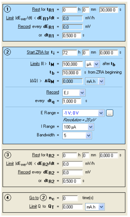 實驗中使用的腐蝕電解池為Bio-Logic的三電極電解池,其中每個夾持器插入一個AISI 1018磁盤。工作電極、輔助電極和偽參比電極使用相同的材料。當三個電極形成一個等邊三角形時,每個電極平面彼此相等。每個樣品用240和600粒度的碳化硅紙拋光,在乙醇中漂洗并在空氣中干燥。環境溫度保持在25°C,溶液放在露天,無需額外攪拌。將電解池置于法拉第籠中,用VSP-300進行測量。軟件版本為EC-Labv10.20,選用ZRA技術,條件如圖1所示,默認濾波器為50kHz。