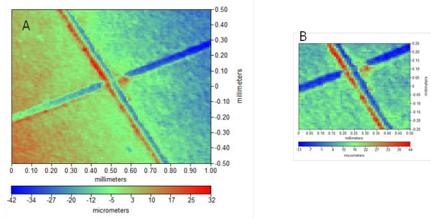 M470(或M370)連接OSP傳感器頭,可以檢測漫散射激光,從而測定十字特征位置的形貌。在X軸和Y軸分別重復(fù)進(jìn)行OSP線掃描,每次掃描后通過螺釘調(diào)整樣品水平。經(jīng)過多次掃描,樣品十字區(qū)域調(diào)至水平,足夠進(jìn)行SECM實(shí)驗(yàn)。調(diào)平前后樣品十字區(qū)域的OSP面掃描結(jié)果如圖3所示。