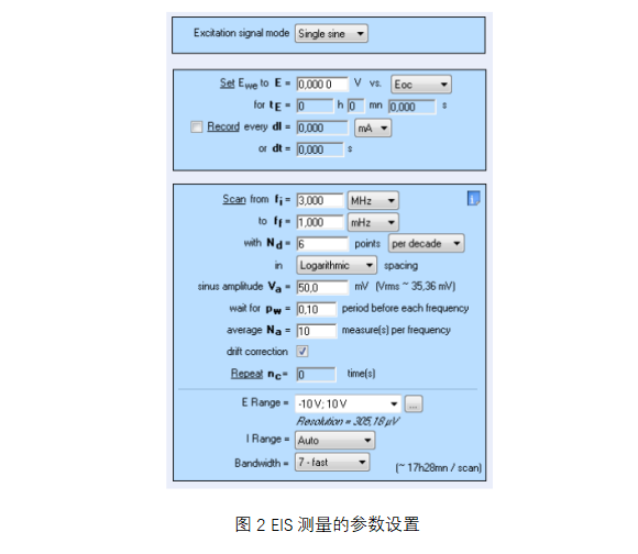 為了在R/C或R+C中選擇合適的等效電路,需要在較寬的頻率范圍(即3 MHz至1 mHz)上進行EIS測量。設(shè)置如圖2所示。
