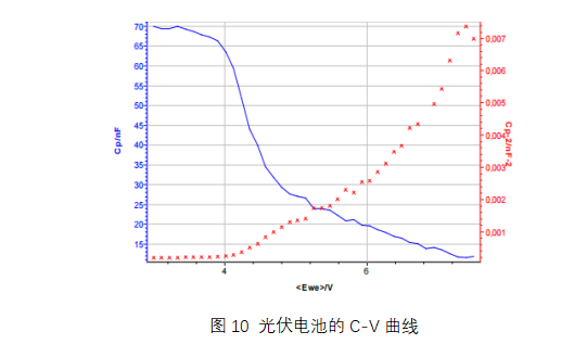 其中e是電子電荷(1.60 x 10-19 C),ε0是半導(dǎo)體介電常數(shù)(硅為1.03 x 10-12 F/cm)。A是光伏電池的表面,21 cm2 ,C是電容(F),E是電壓(V)。