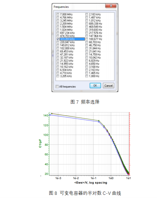 SPEIS7MHz-1Hz允許用戶使用Zfit工具在不同頻率下擬合電容值C1(頻率選擇窗口如圖7所示)。圖8中的C1與實驗中已經(jīng)計算的Cp值進行了比較。C1和Cp在低電壓下的值約為140 pF,在高電壓下的值約為20 pF。因此,比較表明,用Zfit計算的C1和直接在EIS技術(shù)中確定的Cp是相同的。